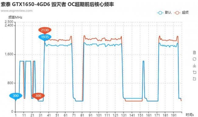 Также оказалось, что новая версия GeForce GTX 1650 неплохо поддаётся разгону. Графический процессор удалось вручную разогнать почти на 200 МГц до уровня 2130 МГц. В свою очередь видеопамять была разогнана на 375 МГц, что позволило добиться эффективной частоты в 15 ГГц. В итоге общая производительность новинки выросла ещё на 10 %.