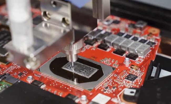 Затем дозирующее устройство наносит двумя каплями дополнительное количество жидкого металла, которое уже распределяется по кристаллу само собой под воздействием естественных сил. После монтажа пористой удерживающей прокладки материнская плата ноутбука готова к монтажу элементов системы охлаждения. ASUS добавляет, что пока использует серийный вариант термоинтерфейса Thermal Grizzly Condactonaut, поскольку не хотела сотрудничать с производителем на этапах экспериментов из соображений секретности.