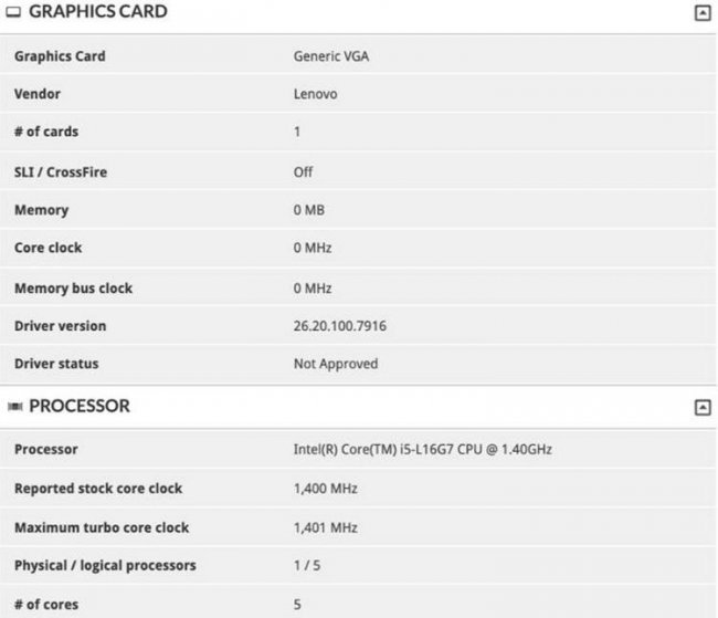 Этот тест в очередной раз подтвердил наличие у Core i5-L16G7 пяти вычислительных ядер, которые работают на пять потоков. Базовая частота процессора составила 1,4 ГГц, а вот максимальная Turbo-частота определена не была. Прежние утечки указывали, что она составит 2,95 ГГц. Также тест не раскрыл характеристик встроенной графики.