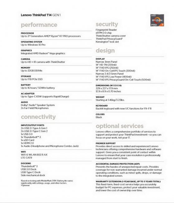 Компания Lenovo в феврале этого года анонсировала новые ноутбуки ThinkPad на базе процессоров AMD Ryzen 4000: ThinkPad T14, ThinkPad T14s и ThinkPad X13. Тогда большой новостью для многих стало упоминание в технических характеристиках каждой из новинок порта Thunderbolt 3. Но с приближением начала продаж выяснилось, что данный порт в ноутбуках отсутствует. Поддержка Thunderbolt всегда являлась одним из важных преимуществ ноутбуков, работающих на базе процессоров Intel. Например, через Thunderbolt можно подключить внешнюю видеокарту, что позволит существенно «прокачать» графическую систему. Но поскольку стандарт был разработан компанией Intel, то в ноутбуках на базе процессоров AMD этого порта не было. Указание порта на новых моделях ThinkPad на базе AMD Ryzen 4000 стало настоящим откровением. Но, как выяснили коллеги с портала Notebook Check, изначально представленные прессе в феврале технические характеристики ноутбуков ThinkPad на базе AMD Ryzen 4000 содержали сразу несколько ошибок. Информация сайта - «print-prime.ru» Журналисты смогли найти на просторах Сети обновленную техническую информацию для моделей T14 и T14s. Во-первых, выяснилось, что в обновленных данных не значатся порты Thunderbolt 3 для этих моделей. Помимо этого, у модели T14 отсутствует сетевой порт RJ45, который также присутствовал в изначально представленных в феврале технических данных. Информация сайта - «print-prime.ru» Другими словами, Lenovo изначально сообщила прессе неправильные спецификации своих устройств. Обращение в Lenovo подтвердило это предположение. К слову, прочие представленные к настоящему моменту ноутбуки на базе процессоров AMD Ryzen 4000 от других производителей также не заявляют наличие портов Thunderbolt 3. Речь идёт, например, о таких моделях, как Acer Swift 3 и Aspire 5, ROG Zephyrus G14 и TUF Gaming A15 от ASUS, G5 15 Special Edition от Dell и Bravo 15 от MSI.