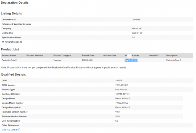 Сегодня стало известно, что новые беспроводные наушники производства Xiaomi, получившие название Redmi AirDots2 и номер модели TWSEJ061LS, прошли сертификацию Bluetooth SIG. Как выяснилось, новые беспроводные наушники будут подключаться посредством Bluetooth 5.0.