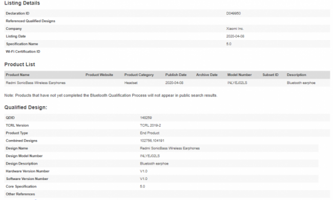 AirDots 2 не единственный аудиопродукт Redmi, который находится на одной из финальных стадий разработки. Вчера Bluetooth SIG также опубликовала информацию о сертификации беспроводных наушников Redmi SonicBass c номером модели INLYEJ02LS. Про них и вовсе пока что известно лишь то, что они будут подключаться по Bluetooth 5.0.
