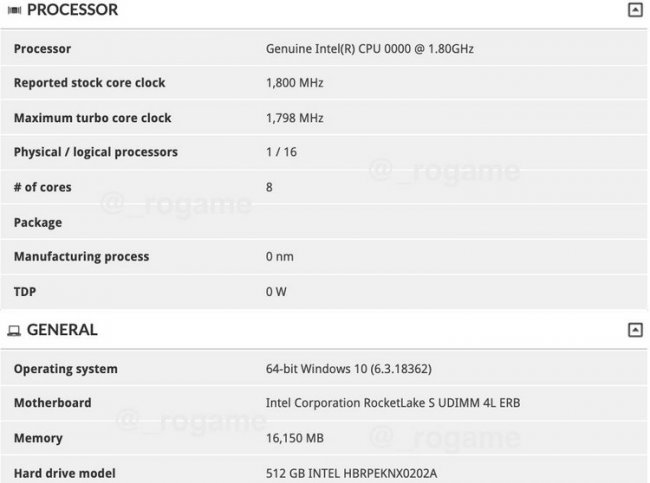 О принадлежности новинки к семейству Rocket Lake-S свидетельствует название материнской платы, лежащей в основе протестированной системы — «RocketLake S UDIMM 4L ERB». Название процессора определено тестом традиционно для инженерных образцов — «Intel CPU 0000».