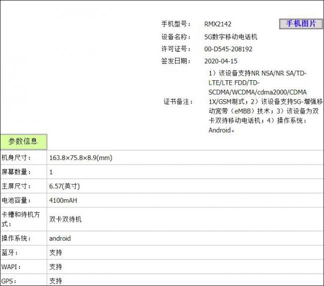 Ожидается, что модель RMX2142 пополнит ассортимент 5G-смартфонов среднего уровня. Основой устройства может стать процессор Qualcomm Snapdragon 765G или чип MediaTek Dimensity 800.