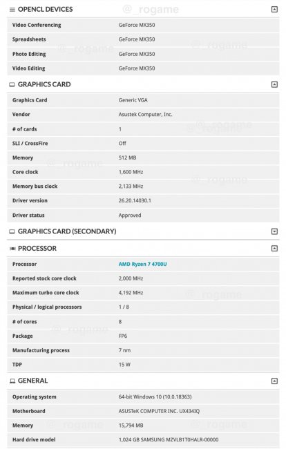 Сетевые источники сообщают, что компания ASUS готовит пополнение для своей серии ультратонких ноутбуков Zenbook в виде новой модели Zenbook 14 UX434IQ. В качестве одной из конфигураций ультрабук сможет предложить набор из мобильного процессора AMD серии Ryzen 4000, а также мобильной дискретной графической карты NVIDIA MX 350. Учитывая компактность моделей Zenbook 14, ASUS всегда отдавала предпочтение мобильным процессорам U-серии с номинальным TDP в 15 Вт. Поэтому в качестве одной из опций новая модель ZenBook 14 сможет предложить свежий процессор Ryzen 7 4700U (8 ядер, 16 потоков, L3-кеш 8 Мбайт), построенный на базе 7-нм микроархитектуры Zen 2. Его базовая частота составляет 2 ГГц. В режиме Turbo-boost кристалл может автоматически разгоняться до 4,1 ГГц. Помимо этого, ноутбук будет оснащён 16 Гбайт оперативной памяти стандарта LPDDR4-4266. Графическая подсистема новинки состоит из интегрированных в процессор 7 вычислительных блоков Vega с эффективной частотой 1600 МГц. Для более производительных задач предусмотрен дискретный видеоускоритель NVIDIA GeForce MX350. Согласно спецификациям, он построен на базе 14-нм GP107 (Pascal), имеет 640 ядер CUDA с базовой и эффективной частотой 1354 и 1468 МГц соответственно. Кроме того, здесь выделено 2 Гбайт видеопамяти стандарта GDDR5 с 64-бит шиной, скоростью передачи данных 7 Гбит/с и пропускной способностью в 56,06 Гбайт/с. Что касается производительности, то GeForce MX350 представляет собой нечто среднее между GeForce GTX 1050 и GTX 960M.