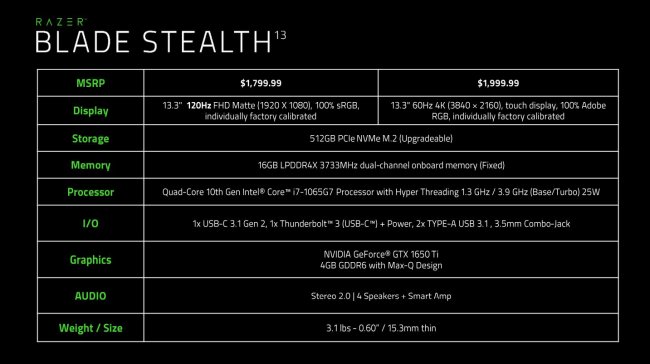 В продажу обновлённая версия игрового ультрабука Razer Blade Stealth поступит в мае. Стоимость FHD-версии начнётся с $1799. За версию с сенсорной 4K-панелью попросят от $1999.