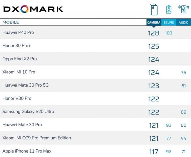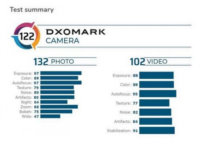 Он получил 132 балла за качество фотографий, но всего 102 балла за возможности видеосъёмки. Итоговый результат составил 122 балла, что поставило его в один ряд с Honor V30 Pro. При этом устройство уступило таким смартфонам, как Huawei P40 Pro (128 баллов), Honor 30 Pro+ (125), Oppo Find X2 Pro (124), Xiaomi Mi 10 Pro (124) и Huawei Mate 30 Pro 5G (123).