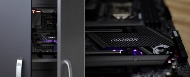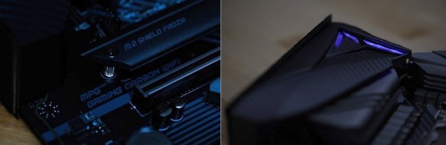 Компания MSI в свою очередь демонстрирует одну материнскую плату серии Gaming Carbon, но с самых разных ракурсов. На одном из фото компания обратила внимание на RGB-подсветку новинки, а на другом — на наличие радиаторов для SSD-накопителей на слотах M.2.