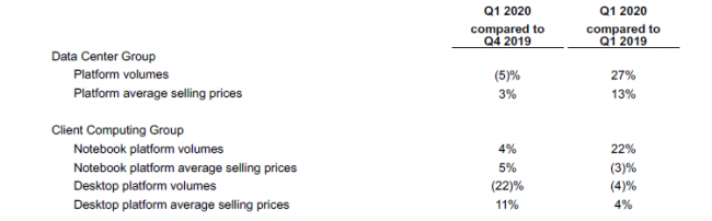 На направлении ПК выручка выросла на 14 %, в сегменте ноутбуков — на 19 %. Настольные процессоры и компоненты сократили выручку на 2 %. Объёмы поставок компонентов для ноутбуков в годовом сравнении увеличились на 22 %, в настольном сегменте они сократились на 4 %. В последовательном сравнении объёмы поставок в настольном сегменте упали сразу на 22 %, но средняя цена реализации выросла на 11 %. В сегменте ноутбуков, напротив, средняя цена реализации компонентов по сравнению с первым кварталом 2019 года уменьшилась на 3 %. Это объясняется тем, что для удалённой работы чаще выбираются ноутбуки с более дешёвыми процессорами.