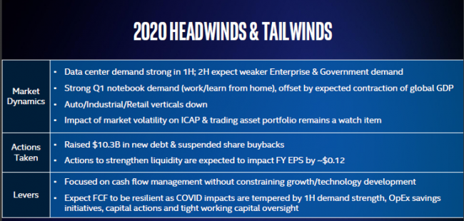 Кризисные явления не должны повлиять на сроки освоения прогрессивных технологий. Конечно, по некоторым статьям капитальные затраты Intel сдвинулись дальше на шесть или восемь недель, но это не коснулось затрат на освоение 10-нм, 7-нм и 5-нм техпроцессов. Начало выпуска 7-нм продуктов по-прежнему намечено на четвёртый квартал 2021 года. Переход на 10-нм техпроцесс осуществляется быстрее собственных ожиданий Intel, но по итогам текущего года он всё равно не будет доминировать в производственной программе компании.