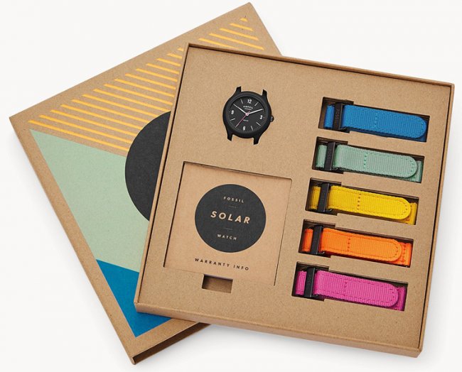 Компания Fossil представила весьма любопытную новинку — аналоговые часы Solar, созданные с заботой об окружающей среде. Поставки хронометра планируется организовать в первых числах следующего месяца. Главная особенность новинки — возможность подзарядки встроенного аккумулятора за счёт солнечной энергии. В обод вокруг циферблата интегрированы солнечные элементы, способные подзаряжать батарею в светлое время суток или даже от осветительных приборов. Утверждается, что на полной зарядке аккумулятора часы могут функционировать в течение четырёх месяцев. Таким образом, при обычной эксплуатации владельцам вообще не придётся беспокоиться о возможном разряде элемента питания. В правой части гаджета предусмотрена коронка управления. Новинка может похвастаться влагозащищённым исполнением (5 ATM). При изготовлении элементов корпуса применяются материалы, не наносящие ущерба окружающей среде. Упаковка полностью выполнена из картона, который может быть использован повторно. Комплект поставки включает сменные ремешки в пяти ярких вариантах цветового исполнения — розовом, оранжевом, жёлтом, синем и салатовом. Модель Fossil Solar доступна для заказа в версиях с размером корпуса 34 и 42 мм. Приобрести новинку можно по ориентировочной цене $140.