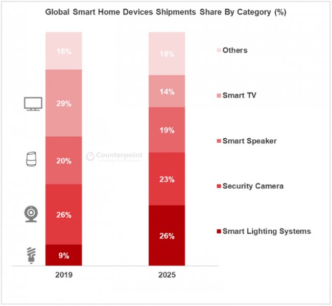 К 2025 году, полагает Counterpoint Technology Market Research, структура рынка претерпит серьёзные изменения. Так, на первое место по количеству реализованных устройств выйдут «умные» осветительные приборы с долей в 26 %. Примерно 23 % составят камеры видеонаблюдения, 19 % — смарт-динамики. При этом доля смарт-ТВ сократится до 14 %.