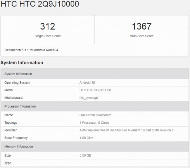 В популярном бенчмарке GeekBench уже замечен загадочный смартфон HTC с шифром 2Q9J10000: предположительно, это и есть модель Desire 20 Pro. Аппарат несёт на борту восьмиядерный процессор Qualcomm (возможно, Snapdragon 660 или Snapdragon 665) и 6 Гбайт оперативной памяти. В качестве программной платформы значится операционная система Android 10.