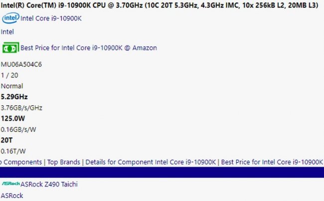 В свою очередь новая запись в базе теста SoSoftware в очередной раз подтверждает способность Core i9-10900K автоматически разгоняться до частоты в 5,3 ГГц. Как в этом, так и в вышеописанном тесте процессор работал на материнской плате ASRock Z490 Taichi.