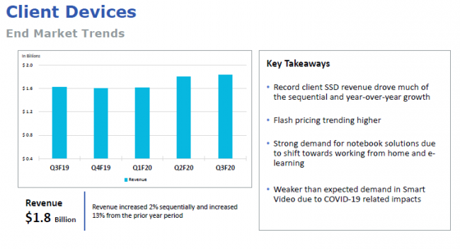 Спрос на клиентские твердотельные накопители, по мнению руководства WDC, продолжит расти в текущем квартале. Выручка от реализации настольных жёстких дисков сократилась, как и на направлении систем видеонаблюдения. В отличие от аналогичного периода прошлого года, в прошедшем квартале WDC избежала убытков, хотя операционная прибыль и не превысила $153 млн, а чистая прибыль — $17 млн.