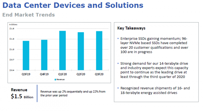 До конца третьего квартала, по мнению руководства WDC, жёсткие диски объёмом 14 Тбайт будут самым популярным товаром в сегменте центров обработки данных. Компания уже начала получать выручку от реализации жёстких дисков объёмом 16 и 18 Тбайт, использующих технологию записи с «энергетическим содействием». В корпоративном сегменте росли объёмы поставок твердотельных накопителей, модели на базе 96-слойной памяти с поддержкой протокола NVMe уже прошли испытания силами 20 компаний-клиентов, ещё 100 клиентов занимаются такими испытаниями в настоящий момент.