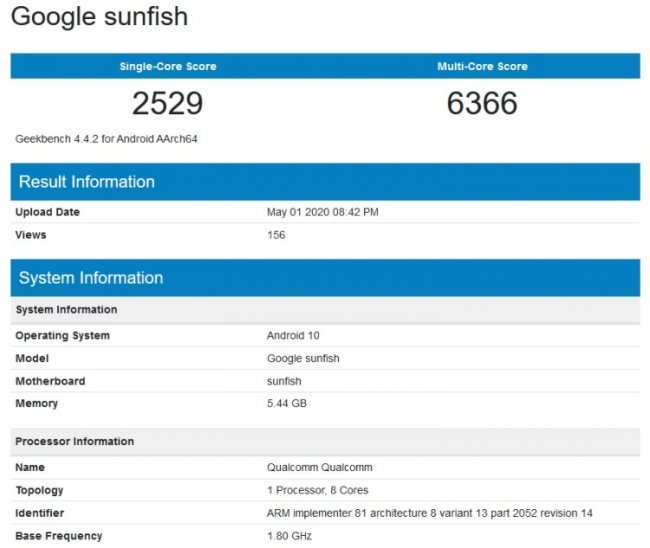 С момента появления смартфонов семейства Pixel разработчики из Google практически всегда присваивают уникальные кодовые имена каждой отдельной модели. В феврале этого года стало известно, что смартфон Pixel 4a получил кодовое имя Sunfish. Теперь же в бенчмарке Geekbench было протестировано устройство под названием Google Sunfish, которое, судя по всему, и является аппаратом 4a.