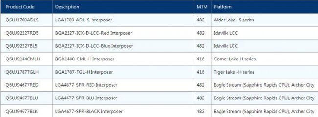 Всё чаще появляются новости о процессорах Intel семейства Alder Lake-S, которые станут первыми обладателями конструктивного исполнения LGA 1700. Один из тайваньских производителей подложек для микропроцессорной продукции на своём сайте уже упоминает исполнение LGA 1700 рядом с условным обозначением «Alder Lake-S», что является новым доказательством предстоящей смены разъёма. Рядом упоминаются 10-нм серверные процессоры Intel Sapphire Rapids в исполнении LGA 4677 в трёх цветовых исполнениях.