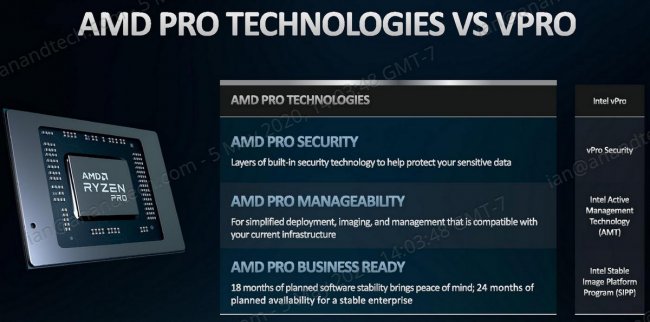 Компания AMD сегодня представила новую серию мобильных процессоров — Ryzen Pro 4000, которые пополнили семейство 7-нм чипов Renoir на ядрах Zen 2. Новинки главным образом отличаются от вышедших ранее потребительских Ryzen 4000 лишь более продвинутыми возможностями для защиты информации. Всего AMD представила три новые модели Ryzen Pro. Это четырёхъядерный Ryzen 3 Pro 4450U, шестиядерный Ryzen 5 Pro 4650U и восьмиядерный Ryzen 7 Pro 4750U. Все три процессора поддерживают SMT, то есть обеспечивают вдвое больше потоков, нежели имеют ядер. Базовые частоты процессоров составляют от 1,7 до 2,5 ГГц, а максимальные в режиме Boost достигают 3,7–4,1 ГГц. Имеется у новинок и встроенная графика Vega второго поколения. Процессоры Ryzen 3 Pro 4450U, Ryzen 5 Pro 4650U и Ryzen 7 Pro 4750U обладает встроенными GPU соответственно с пятью, шестью и семью исполнительными блоками (320, 384 и 448 потоковых процессоров). Объём кеша третьего уровня составляет 4 или 8 Мбайт (у младшей и двух старших моделей соответственно), а на каждое ядро приходится по 512 Кбайт кеша второго уровня. Компания AMD отмечает значительный прирост производительности новинок по сравнению с прошлым поколением мобильных чипов Ryzen Pro. Производитель называет Ryzen 7 Pro 4750U самым быстрым процессором для ультратонких бизнес-ноутбуков. Также заявляется высокая энергоэффективность: тот же Ryzen 7 Pro способен обеспечить более 20 часов автономной работы в «системах премиум-класса». Отмечается высокая степень защищённости новых процессоров от кражи данных. AMD указывает на защиту на каждом уровне от кристалла до операционной системы, а также защиту памяти. Ещё в бизнес-сфере окажутся полезны расширенные возможности новых чипов для удалённого управления, а также высокий уровень качества и стабильности.