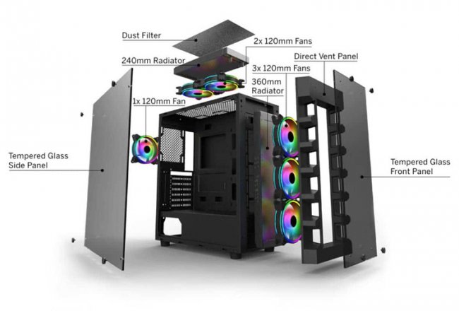 Новинка имеет строгий, но в то же время эффектный облик. Фронтальная панель изготовлена из затемнённого закалённого стекла, через которое могут просматриваться вентиляторы с подсветкой. Кроме того, из стекла выполнена боковая стенка.