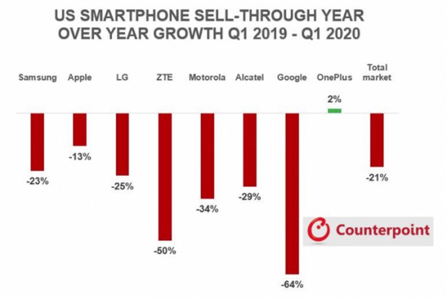 С резким снижением продаж столкнулись все ведущие игроки рынка. Так, спрос на аппараты Samsung на рынке США уменьшился практически на четверть — на 23 %. Отгрузки Apple снизились на 13 %, LG — на 25 %. Спрос на смартфоны Motorola сократился на треть, на «трубки» Google — на 64 %. И только компании OnePlus в условиях пандемии удалось продемонстрировать рост продаж: он составил 2 %.