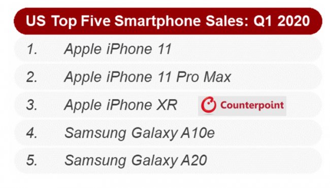 По итогам первой четверти 2020 года самыми популярными в США смартфонами стали Apple iPhone 11, iPhone 11 Pro Max и iPhone XR, а также Samsung Galaxy A10e и Galaxy A20.