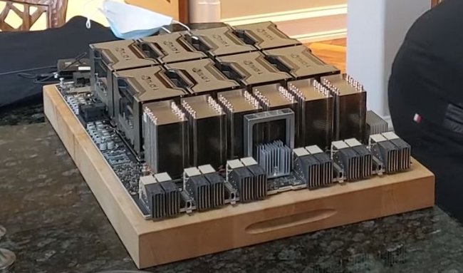 Стоп-кадры позволяют разглядеть восемь радиаторов системы охлаждения, которые явно украшают графические процессоры. Если учесть, что недавно NVIDIA зарегистрировала торговое наименование «DGX A100», перед нами запросто может оказаться наследница вычислительной системы DGX-2, которая сейчас использует графические процессоры поколения Volta. Разница заключается в том, что DGX-2 содержит 16 графических процессоров Volta, а DGX A100 вполне может ограничиться восемью графическими процессорами нового поколения.
