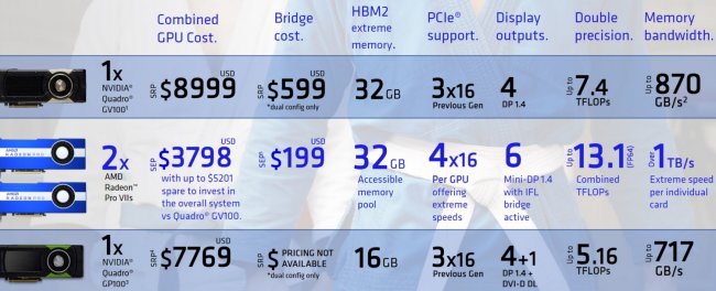 По данному показателю видеокарта AMD способна конкурировать с куда более дорогими решениями NVIDIA. Например, NVIDIA Quadro GP100 на базе Pascal обладает производительностью FP64 всего в 5,16 Тфлопс, тогда как Quadro GV100 способна обеспечить до 7,4 Тфлопс. При этом цена данных ускорителей составляет $7769 и $8999 соответственно.