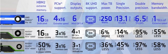 Ещё важным по мнению AMD отличием профессиональной Radeon Pro VII от потребительской Radeon VII является поддержка интерфейса PCIe 4.0, что увеличивает скорость обмена данными с процессором. К слову, при создании связок из нескольких Radeon Pro VII используются мосты с шиной Infinity Fabric с пропускной способностью 168 Гбайт/с. А для вывода изображения на Radeon Pro VII имеется шесть портов Mini DisplayPort 1.4 с поддержкой разрешений до 8K и расширенного динамического диапазона (HDR).