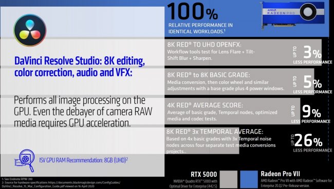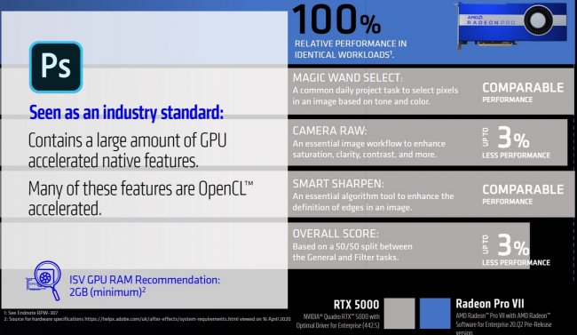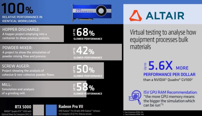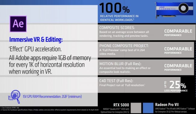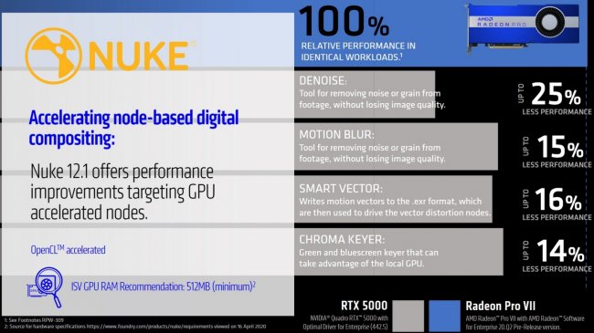 Согласно информации AMD, в реальных задачах Radeon Pro VII также оказывается либо впереди, либо наравне с Quadro RTX 5000. В обработке видео наблюдается значительный перевес в приложениях Nuke и DaVinci. В Adobe After Effects и Photoshop видеокарты оказываются примерно наравне. В ПО для расчётов движения частиц Altair EDEM преимущество новинки AMD составляет 42–68 %.