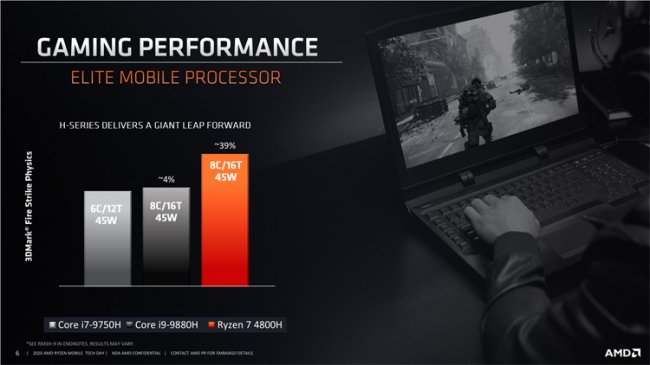 В то же время первые мобильные компьютеры на 7-нм процессорах семейства AMD Renoir уже появились в продаже как по всему миру, так и в России. Если говорить об отечественном рынке, то в магазинах, в частности, доступны различные версии ноутбука Acer Swift 3 (SF314-42), построенного на процессорах Ryzen 3 4300U, Ryzen 5 4500U или Ryzen 7 4700U с четырьмя, шестью и восемью ядрами соответственно и тепловым пакетом 15 Вт. Однако все такие мобильные системы относятся к классу ультрабуков, то есть представляют собой тонкие и лёгкие ноутбуки с 14-дюймовым экраном. Более того, они опираются на интегрированное в процессоры графическое ядро Radeon Vega, а значит не могут рассматриваться в качестве полноценных геймерских систем.