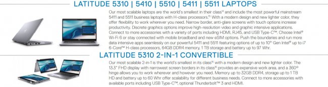 В отличии от указанных выше новинок, серия среднебюджетных ноутбуков Dell Latitude 5000 является более практичным выбором. В основе обновлённых Latitude 5310, 5410 и 5510, 5411 и 5511 могут использоваться процессоры Intel Comet Lake-H вплоть до шестиядерных чипов.