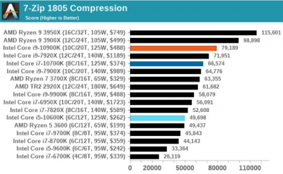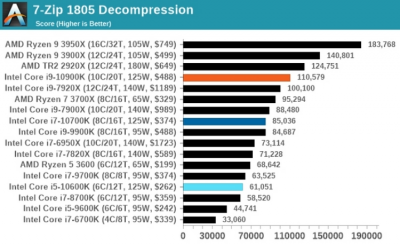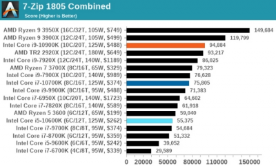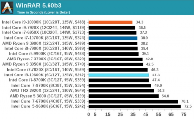 Работа с архивами в 7-Zip показала аналогичную картину: Core i9-10900K немного не дотянул до Ryzen 9 3900X, тогда как в WinRar чип Intel оказался быстрее. При кодировании и декодировании видео в Handbrake процессор Intel максимально приблизился к 16-ядерному Ryzen 9 3950X при использовании кодека HEVC, а вот с более старым x264 оказался немного медленнее Ryzen 9 3900X.