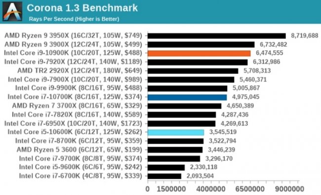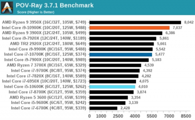 Процессор Core i9-10900K ожидаемо показывает весьма высокий уровень производительности как в играх, так и в рабочих задачах. В рендеринге 3D-графики новинка Intel максимально приблизилась к своему прямому конкуренту в лице Ryzen 9 3900X при использовании большинства рендереров, а в POV-Ray 3.7.1 и вовсе смогла оказаться впереди. Примечательно, что 10-ядерная новинка Intel оказалась быстрее 12-ядерного Core i9-7920X. Тесты в рабочих задачах Core i9-10900K