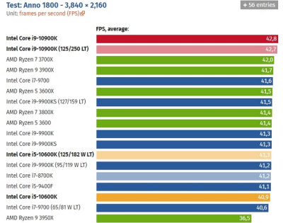 А вот в более высоком разрешении 4K (3840 ? 2160 точек) процессор Core i9-10900K почему-то уступил соперникам во многих тестах. Местами он проиграл даже шестиядерным Core i5-9400F и Core i5-10600K. Более того, в отдельных ситуациях производительнее нового флагмана Intel оказался и народный AMD Ryzen 5 3600. Тем не менее, в среднем быстродействие нового процессора Intel Core i9-10900K оказалась на очень высоком уровне.