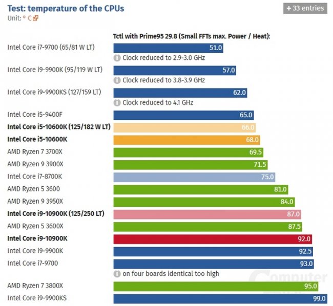 Что касается рабочих температур, то под нагрузкой Core i9-10900K нагревается вплоть до 92 °C. Правда, здесь источник не уточняет, какая именно система охлаждения использовалась.