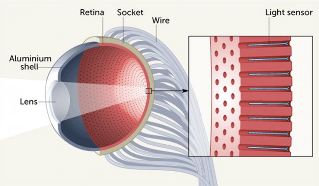 Исследователи из Гонконгского университета науки и технологий создали устройство, которое имитирует строение человеческого глаза. Оно так же чувствительно к свету и при этом обладает большей реакцией, чем настоящее глазное яблоко. В будущем оно может быть использовано для восстановления зрения слепых людей и в производстве человекоподобных роботов. Самой главной частью искусственного глаза является мембрана из оксида алюминия, которая покрыта крошечными датчиками из светочувствительного минерала под названием перовскит. Она выполняет ту же функцию, что и сетчатка человеческого глаза, покрытая чувствительными к свету клетками. Мембрана расположена на задней части искусственного органа зрения и принимает свет, который проходит через линзу на передней части глаза. От искусственной сетчатки идут провода толщиной от 20 до 100 микрометров, которые посылают информацию из датчиков в компьютер — прямо как светочувствительные клетки посылают данные в мозг. В то время как человеческий глаз реагирует на свет за 40-150 миллисекунд, искусственный аналог реагирует на изменения за 30-40 миллисекунд. Также созданный китайскими инженерами глаз видит мир в более высоком разрешении, потому что на его сетчатке расположено 460 миллионов световых сенсоров на квадратный сантиметр. Настоящая же сетчатка имеет только 10 миллионов светочувствительных клеток на квадратный сантиметр. Искусственный глаз хуже настоящего только в плане угла обзора — в то время как человеческий глаз обозревает 150 градусов, новое устройство видит только на 100 градусов. Тем не менее это лучше, чем показатели плоских датчиков изображения. Людей с искусственными глазами можно будет смело называть киборгами. Ожидается, что в далёком будущем гибриды человека и машины смогут отправляться в космос без боязни радиации и других опасных факторов. О таком будущем в 2016 году задумались даже российские учёные — исследования в данном направлении были включены в перечень работ Роскосмоса и Федерального агентства научных организаций (ФАНО).