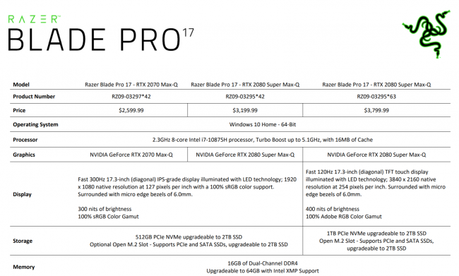 В продажу обновлённая модель игрового ноутбука Razer Blade Pro 17 поступит в конце этого месяца. Базовая конфигурация с графикой NVIDIA GeForce RTX 2070 Max-Q оценивается в $2600. За максимальную конфигурацию ноутбука с графикой NVIDIA GeForce RTX 2080 Super Max-Q компания просит $3800.