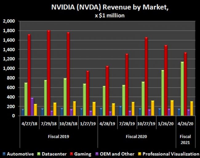В игровом сегменте NVIDIA выручила $1,34 млрд, в серверном — $1,14 млрд, но в последнем случае ещё не учитывалась выручка Mellanox. Уже во втором квартале доля выручки NVIDIA в серверном сегменте может приблизиться к 50 %, поскольку по этой статье будут учитываться и поступления от реализации продукции Mellanox. Если верить слухам, игровые новинки NVIDIA ранее конца третьего квартала не появятся, поэтому ждать всплеска спроса на игровом направлении во втором квартале не приходится. У серверного сегмента есть все шансы выйти на первое место среди источников дохода компании.