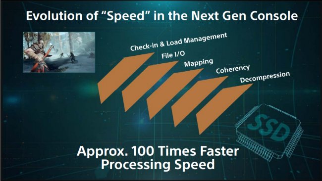 Рассказывая о PS5, Sony заявила, что твердотельный накопитель будущей консоли будет передавать информацию в оперативную память примерно в 100 раз быстрее, чем PS4. Утверждается, что скорость SSD означает, что игры для PS5 (и для Xbox Series X тоже) позволят избегать обычно используемых трюков, маскирующих загрузку новых уровней: длительные поездки на лифте, протискивание сквозь узкие щели и коридоры и тому подобные ухищрения. Также могут исчезнуть загрузочные экраны вроде «путешествия в метро» в Marvel's Spider-Man. Посмотрим, насколько это окажется правдой, когда выйдут игры, сделанные без оглядки на старые системы «эпохи до SSD».