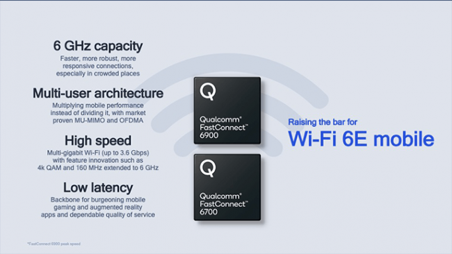 Как заверяет производитель, чипы Qualcomm FastConnect 6900 и 6700 разработаны с нуля, и предназначены для работы в сетях Wi-Fi шестой серии (Wi-Fi 6E) в новом диапазоне частот 6 ГГц, что обеспечивает скорость передачи данных до 3,6 Гбит/с (в FastConnect 6900) или 3 Гбит/с (в FastConnect 6700). Решения на базе FastConnect 6900 будут применяться в премиальных устройствах, 6700 - в массовом сегменте смартфонов.