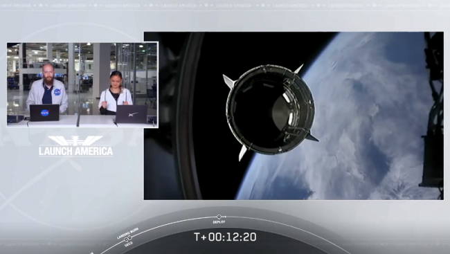 Ракета Falcon 9 успешно преодолела звуковой барьер, после чего произошло отделение первой ступени. Она благополучно села на платформу «Of Course I Still Love You». Вскоре произошло отделение второй ступени и два астронавта оказались на околоземной орбите.