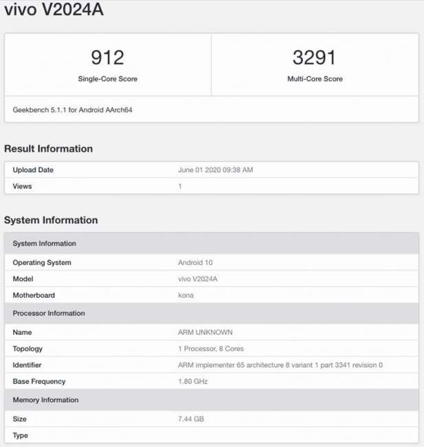 В базе данных популярного теста Geekbench появилась информация о технических характеристиках нового смартфона Vivo флагманского уровня. Аппарат фигурирует под кодовым обозначением V2024A. Информация сайта - «print-prime.ru» Сообщается, что «сердце» новинки — флагманский процессор Qualcomm. Речь идёт о чипе Snapdragon 865, который содержит восемь ядер Kryo 585 с тактовой частотой до 2,84 ГГц и графический ускоритель Adreno 650. Данные Geekbench говорят о наличии в смартфоне 8 Гбайт оперативной памяти. Не исключено, что будет также выпущена модификация с 12 Гбайт ОЗУ. В качестве программной платформы значится операционная система Android 10. В одноядерном тесте аппарат показал результат в 912 баллов, в многоядерном — 3291 балл. Информации о размере и разрешении дисплея пока нет. Вероятнее всего, будет применена панель Full HD с небольшим отверстием или вырезом для фронтальной камеры. В тыльной части корпуса расположится многомодульная камера. Можно предположить, что смартфон сможет функционировать в мобильных сетях пятого поколения (5G). По оценкам Gartner, в первом квартале нынешнего года по всему миру было реализовано 299,1 млн смартфонов. В годовом исчислении поставки рухнули на 20,2 %.