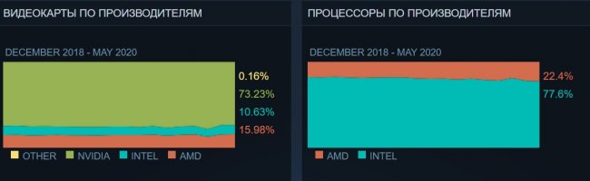 Steam опубликовал результаты мониторинга оборудования, проведённого в мае 2020 года. Компания собрала информацию об аппаратном обеспечении, используемом в компьютерах геймеров по всему миру. Согласно этим данным, AMD продолжает укреплять свои позиции на рынке процессоров. Информация сайта - «print-prime.ru» Конечно, стоит учесть, что собранная Steam статистика отображает данные только по компьютерам, на которых установлено приложение фирменного магазина компании. Однако учитывая его высокую популярность, она даёт достаточно правдоподобную картину. Судя по этой статистике, ПК-геймеры медленно, но верно переходят с процессоров Intel на решения AMD. Статистика за май показывает, что, Intel по-прежнему занимает лидирующие позиции на рынке. 77,54 % пользователей Steam используют процессоры Intel, однако их доля снизилась на 0,74 % за последний месяц в пользу компании AMD. Хотя это снижение может на первый взгляд показаться незначительным, у «синих» есть причины для беспокойства. Дело в том, что компания теряет позиции на рынке с каждым месяцем. Исключением стал лишь март. Кроме того отметим, что популярность набирают шестиядерные процессоры, доля которых по итогам мая составила 22,8 %. Самыми популярными остаются четырёхъядерные чипы, но постепенно их доля сокращается, равно как и двухъядерных. И хотя рост популярности фирменных процессоров не может не радовать AMD, на рынке видеокарт дела компании идут не так хорошо. Здесь абсолютное лидерство принадлежит NVIDIA. Девять из десяти самых часто используемых в геймерских сборках видеоускорителей принадлежат к семейству GeForce. Самой популярной среди ПК-Геймеров остается GTX 1060. Единственная видеокарта AMD, которая попала в десятку лидеров — это Radeon RX 580. Фактически, AMD занимает лишь 15,98 % рынка игровых GPU, в то время как Intel, которая создаёт только интегрированные видеочипы, используется в 10,63 % компьютеров пользователей Steam. Информация сайта - «print-prime.ru» Кроме того, майская статистика сообщает, что большинство геймеров (63,51 %) по-прежнему использует мониторы с разрешением Full HD. Следующим по популярности (10,91 %) является довольно низкое разрешение 1366 ? 768 точек, которое часто используется в бюджетных ноутбуках. И только 2,17% пользователей Steam играют на мониторах с разрешением 4К. Что касается программного обеспечения, абсолютным лидером является 64-разрядная Windows 10, которая установлена на 85,58 % компьютеров геймеров. Второй наиболее часто используемой операционной системой является Windows 7, доля которой в мае выросла на 0,61 %, несмотря на то, что Microsoft прекратила её поддержку ещё в январе.