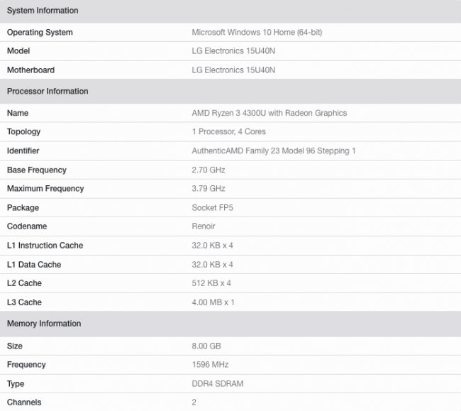 В базе данных синтетического теста Geekbench появилась информация о новом ноутбуке от южнокорейской компании LG. В качестве основы новинка с модельным номером 15U40N использует процессоры AMD Ryzen 4000 (Renoir) U-серии.