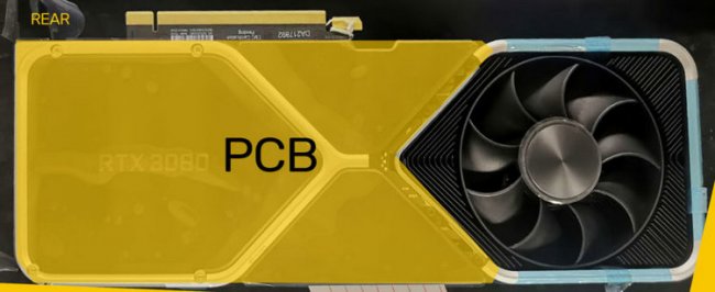Показанная GeForce RTX 3080 имеет печатную плату неправильной формы с V-образным торцом, это видно по задней части платы. Такая конструкция позволила NVIDIA разместить вентилятор на тыльной стороне видеокарты, не увеличивая её толщину. Это напомнинает о видеокарте GeForce GTX 295, у которой также было отверстие для размещения вентилятора в печатной плате.