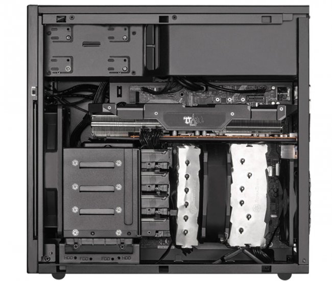 Решение допускает установку материнских плат типоразмера Micro-ATX, Mini-DTX и Mini-ITX. Габариты составляют 210 ? 374 ? 385 мм, вес — приблизительно 6 кг.