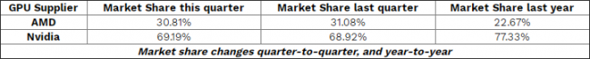 Год назад AMD могла довольствоваться 22,67 % рынка дискретных видеокарт, но в первом квартале этого года она укрепила позиции до 30,81 %. В предыдущем квартале её доля достигала 31,08 %, но потеря 0,27 % рынка не особо укрепила позиции конкурента. NVIDIA в первом квартале текущего года занимала 69,19 % рынка дискретных видеокарт.