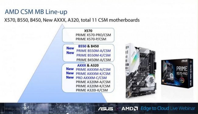 На другом слайде той же презентации ASUS перечислила материнские платы для процессоров AMD, которые входят в серию Corporate Stable Model (CSM), отличающуюся улучшенной стабильностью и надёжностью, что делает их хорошим вариантом для корпоративного использования. Здесь ASUS прямо указала на скорый выход нового чипсета AMD A-серии, то есть логики начального уровня. Очевидно, это будет AMD A520, который сменит вышедший вместе с первыми Ryzen чипсет AMD A320.