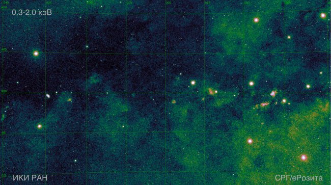 Что касается диапазона 0,7–2,3 кэВ, то в нём проявляются прежде всего внегалактические объекты. Это сотни тысяч ядер активных галактик и квазаров, излучение которых связано с аккрецией вещества на сверхмассивные чёрные дыры, и тысячи массивных скоплений галактик.